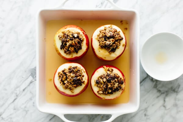 - Fill in the good stuff. In a baking dish, stand the apples upright and stuff with the cinnamon oat mixture.