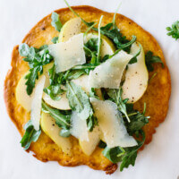 While the batter is cooking, make the salad by gently tossing the pear, arugula, olive oil and lemon juice together in a bowl.