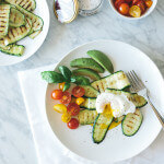 Heat your grill pan on medium-high heat. Place the zucchini ribbons on the grill pan for approximately 30 seconds, then flip. Remove and divide evenly between four plates.