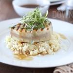 Place one cup of the cauliflower rice on each plate. Add the albacore steaks on top. Drizzle generously with the citrus ginger sauce and place a small handful of micro greens on top. Serve immediately.