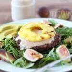 • Remove the burgers and pineapple from the grill when cooked. Place one burger on each bowl of greens. Spread a dollop of fig mayonnaise on top of. Then top with a pineapple slice.