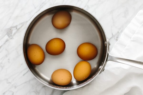 While the eggs are boiling, prepare an ice water bath and set aside.