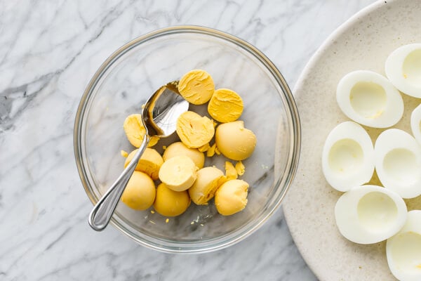 Scoop the yolks into a small bowl and place the egg whites on a serving plate.