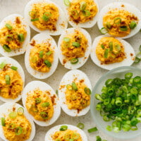 Use a spoon to add a portion of the deviled egg mixture back into the hole of each egg white. Garnish with a sprinkle cayenne and green onions.