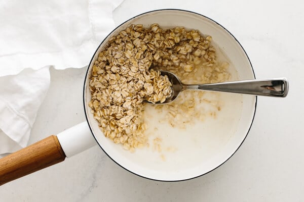 Remove the pan from the heat, cover with a lid, then let it rest for a few minutes. This will give the oats time to absorb the liquid. If they look too dry, stir in a splash more liquid.