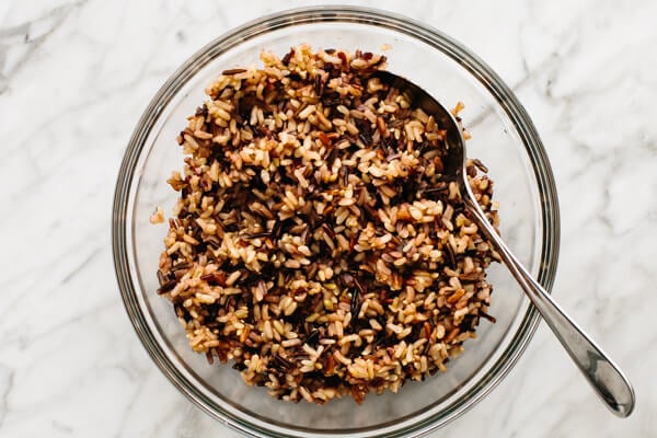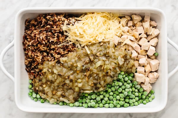 In a 9x13-inch casserole dish, add the cooked wild rice, cooked turkey, frozen peas, cheese, and onion mushroom sauce.