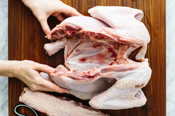 Remove the neck and giblets from your turkey and pat it dry with paper towels. Then place it breast side down on your cutting board. Using poultry shears, cut alongside one side of the backbone from the tail to the neck, repeat on the other side, and remove the backbone.