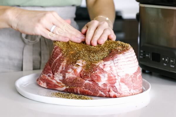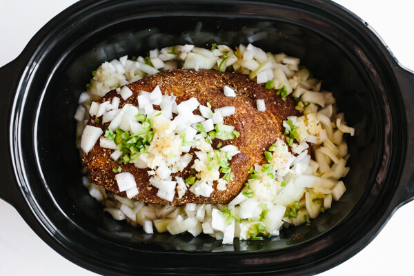 Trim any excess fat from the pork shoulder (but remember that some fat is good), then rub the spice mixture generously around the entire pork shoulder and place in the slow cooker.