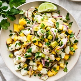 Mango halibut ceviche is the perfect refreshing recipe for spring and summer days! Meaty halibut pieces are tossed with fresh mango, onion, cilantro, jalapeño, and creamy avocado.