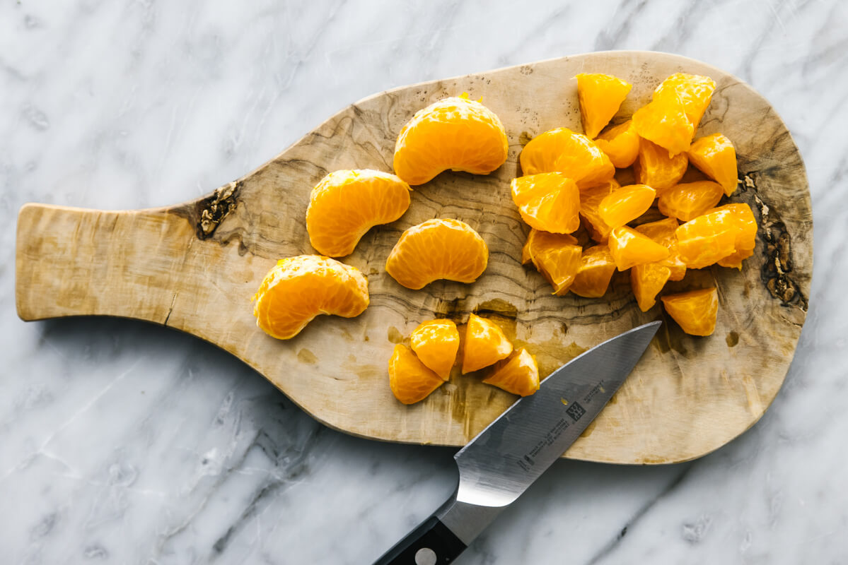 Once you've peeled and segmented the mandarin oranges, slice each segment into quarters.